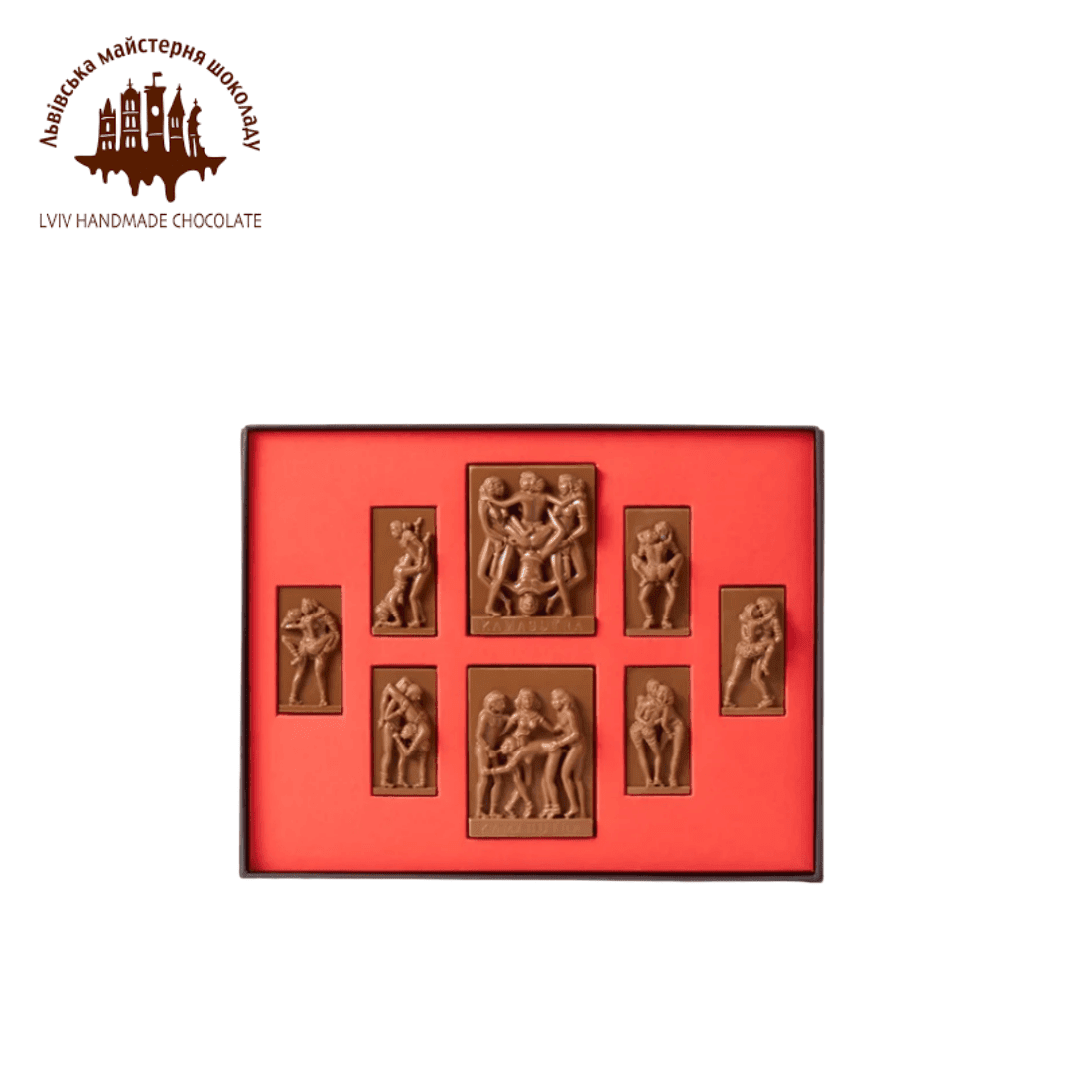 Особливий набір шоколадних барельєфів з Камасутри, виконаний з досконалого молочного шоколаду. Ми розробили вишукане мінімалістичне упакування чорного кольору та оксамитовою внутрішньою частиною. Концептуальний подарунок для насолоди і втіхи.