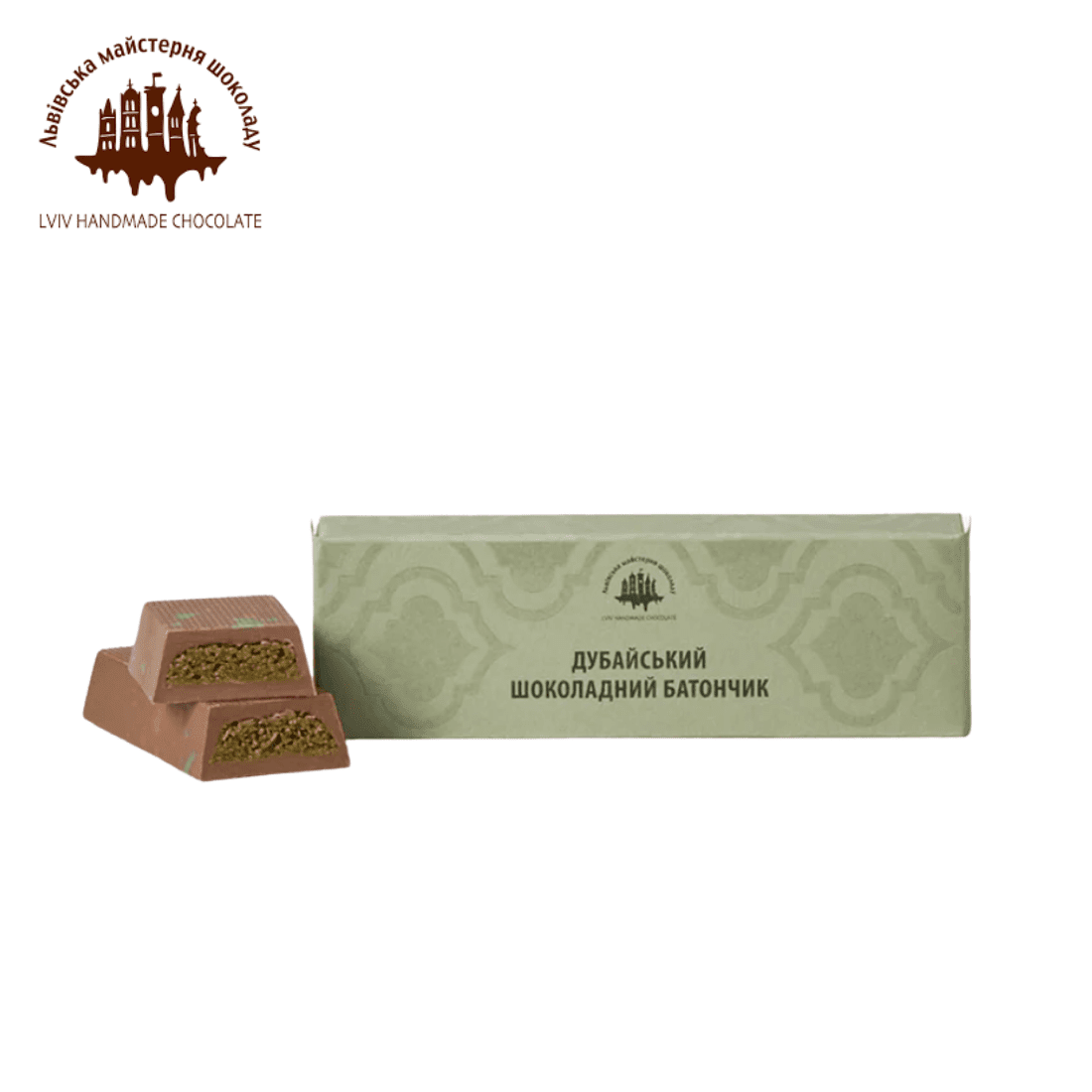 Молочний шоколад з ніжною фісташковою пастою та традиційним грецьким тістом катаїфі. Поєднання кремової шоколадно-горіхової текстури та легкої хрумкості мереживного тіста – знане в світі як “дубайський шоколад”.