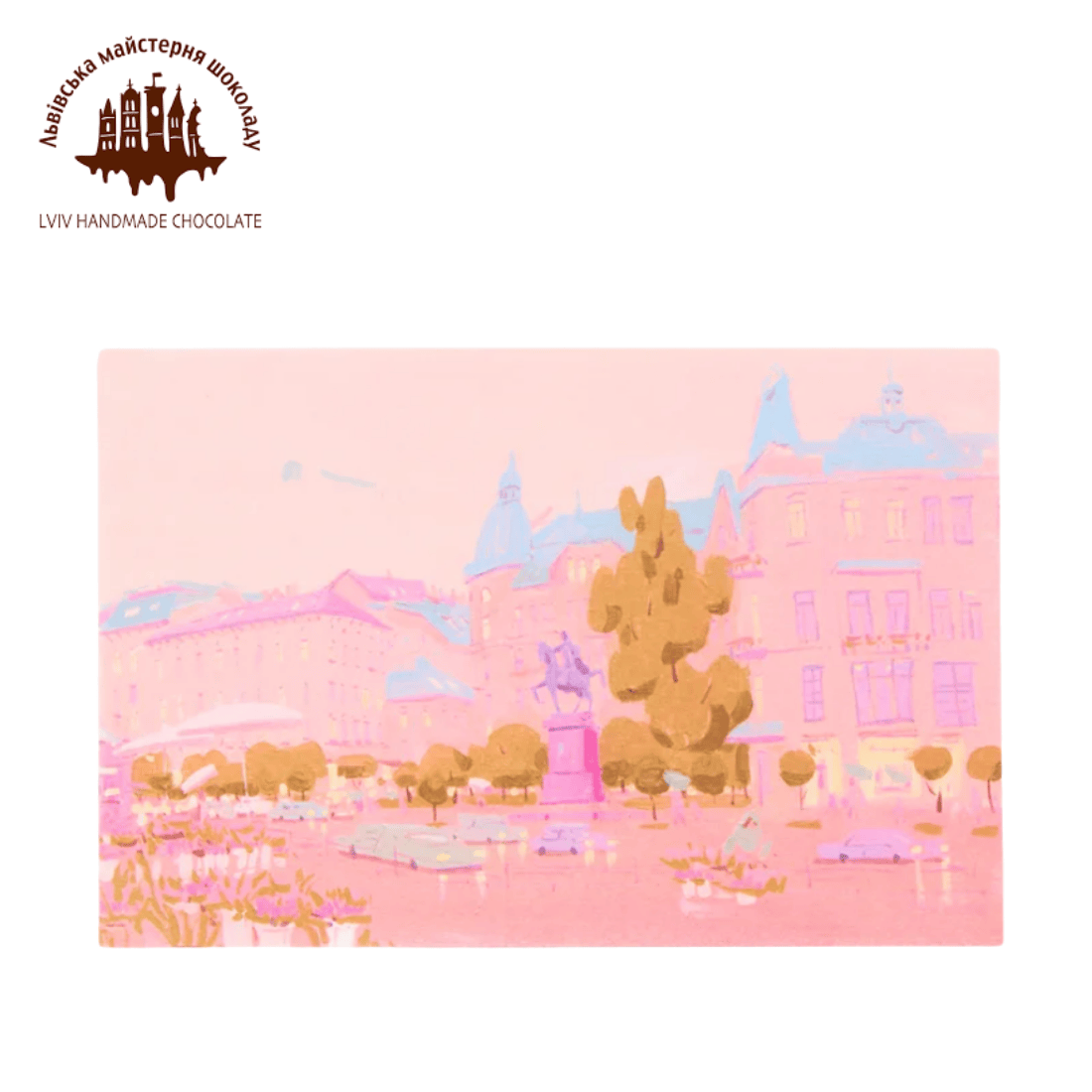 Привітальна листівка з ілюстрацією художниці Оксани Бойко. Зображення з затишною атмосферою вечірнього міста передає, створене спеціально для Львівської майстерні шоколаду.