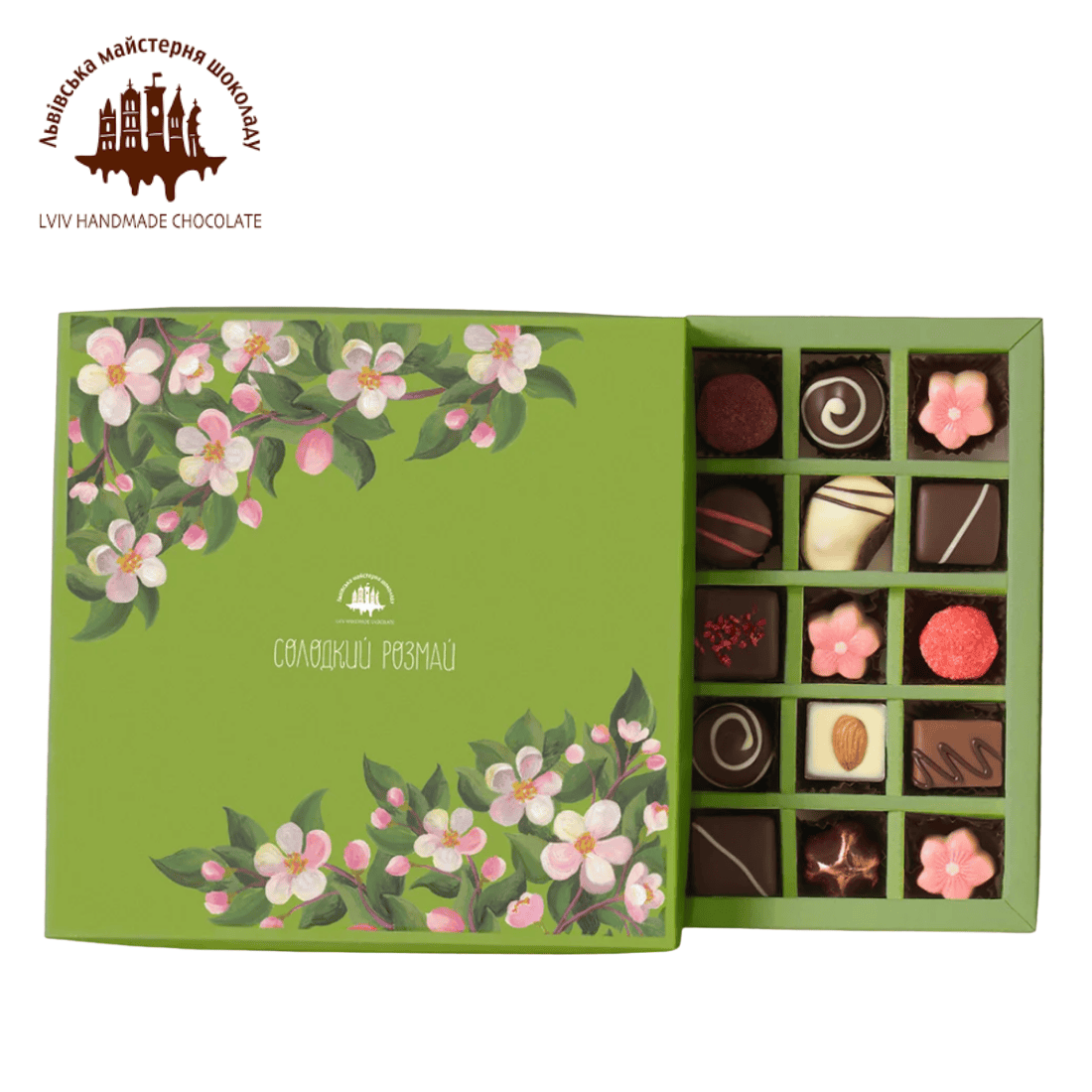 Справжній цукерковий розмай від львівських шоколатьє смакує незабутньо. 25 шоколадних цукерок з різноманітними смаками та начинками – фруктові трюфелі, марципанові, кавові, горіхові, мармеладні чи легкі п’янкі.