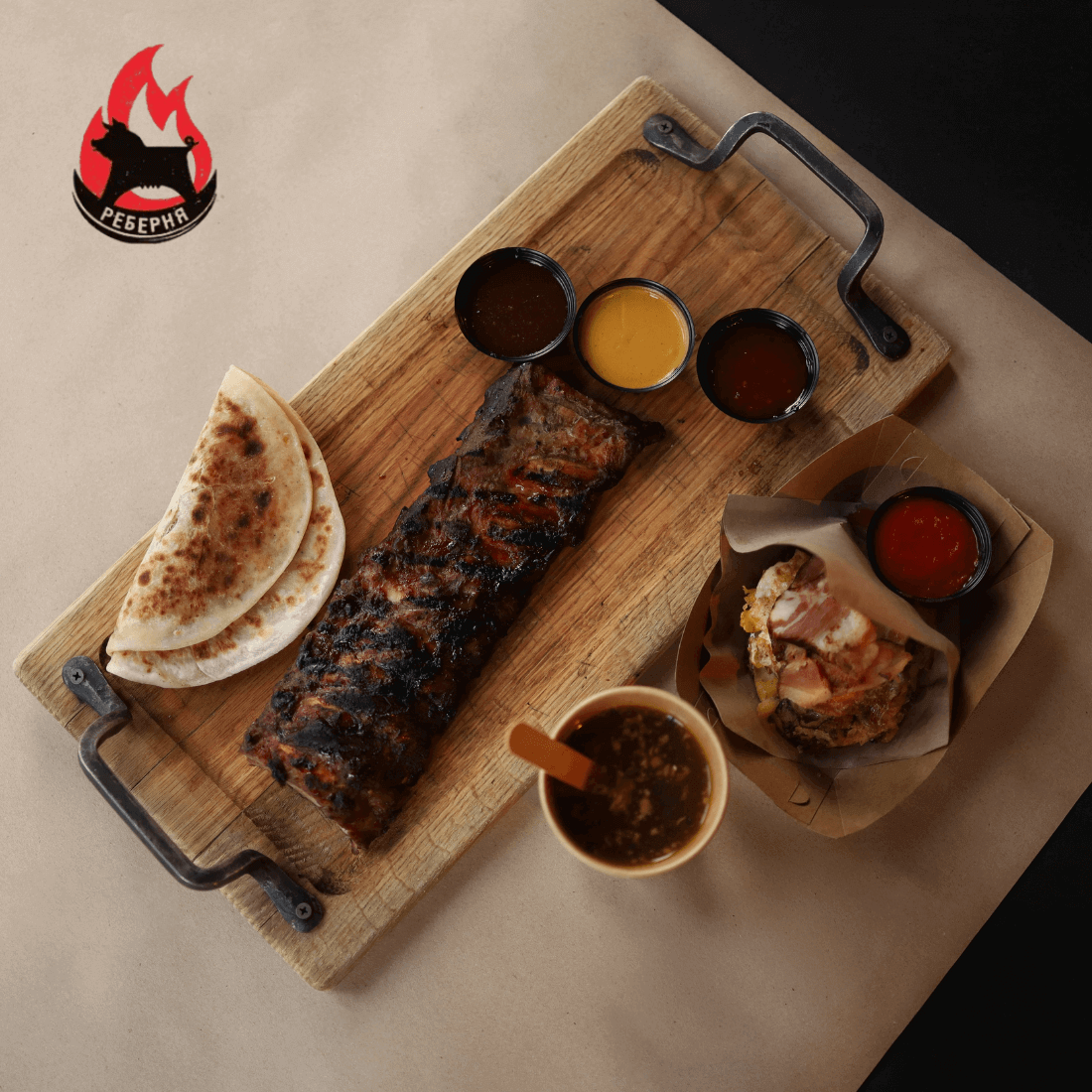 – Ребра на вогні – 1 порція +соус на вибір (барбекю, гірчичний, азійський)