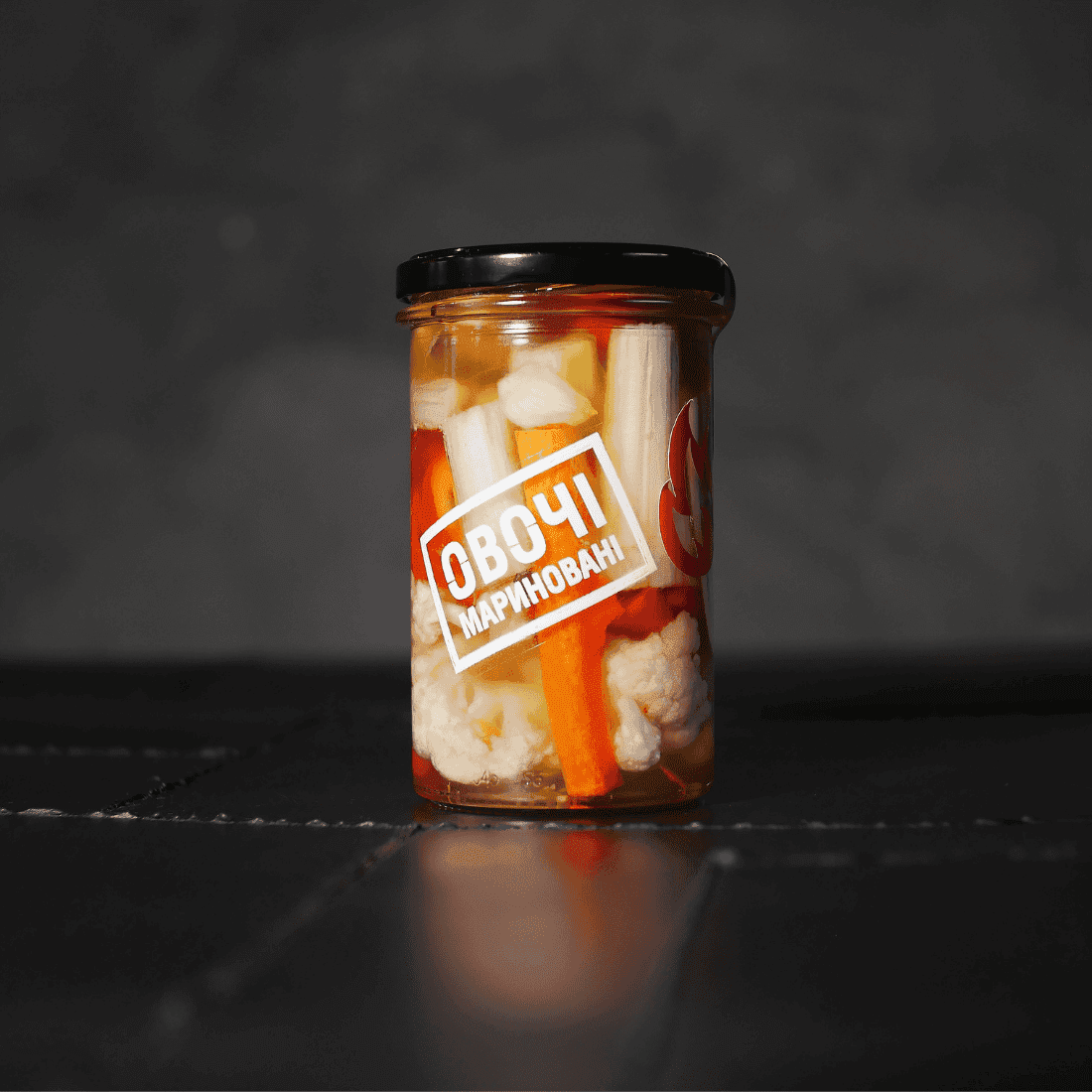 Склад: капуста цвітна, перець болгарський червоний, морква, перець чилі, часник, редиска, олія, оцет винний, оцет яблучний, перець духмяний, лавровий лист, сіль морська, цукор.