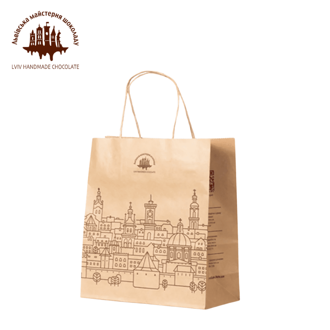 Паперовий пакет середнього розміру з фірмовим дизайном Львівської майстерні шоколаду. Міцний та стильний, чудово підходить для невеликих покупок в нашій крамниці.