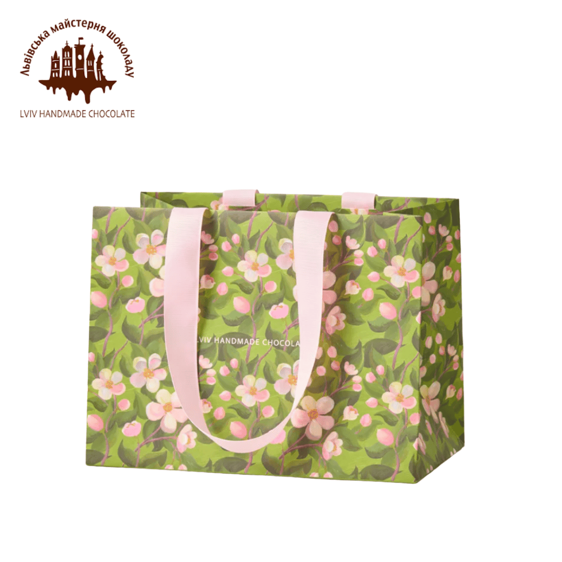 Подарунковий пакет з лагідним квітковим дизайном. Зроблений з міцного картону, приємний на дотик та зручний формат, що вміщає багато шоколадних виробів надасть подарунку чарівності.