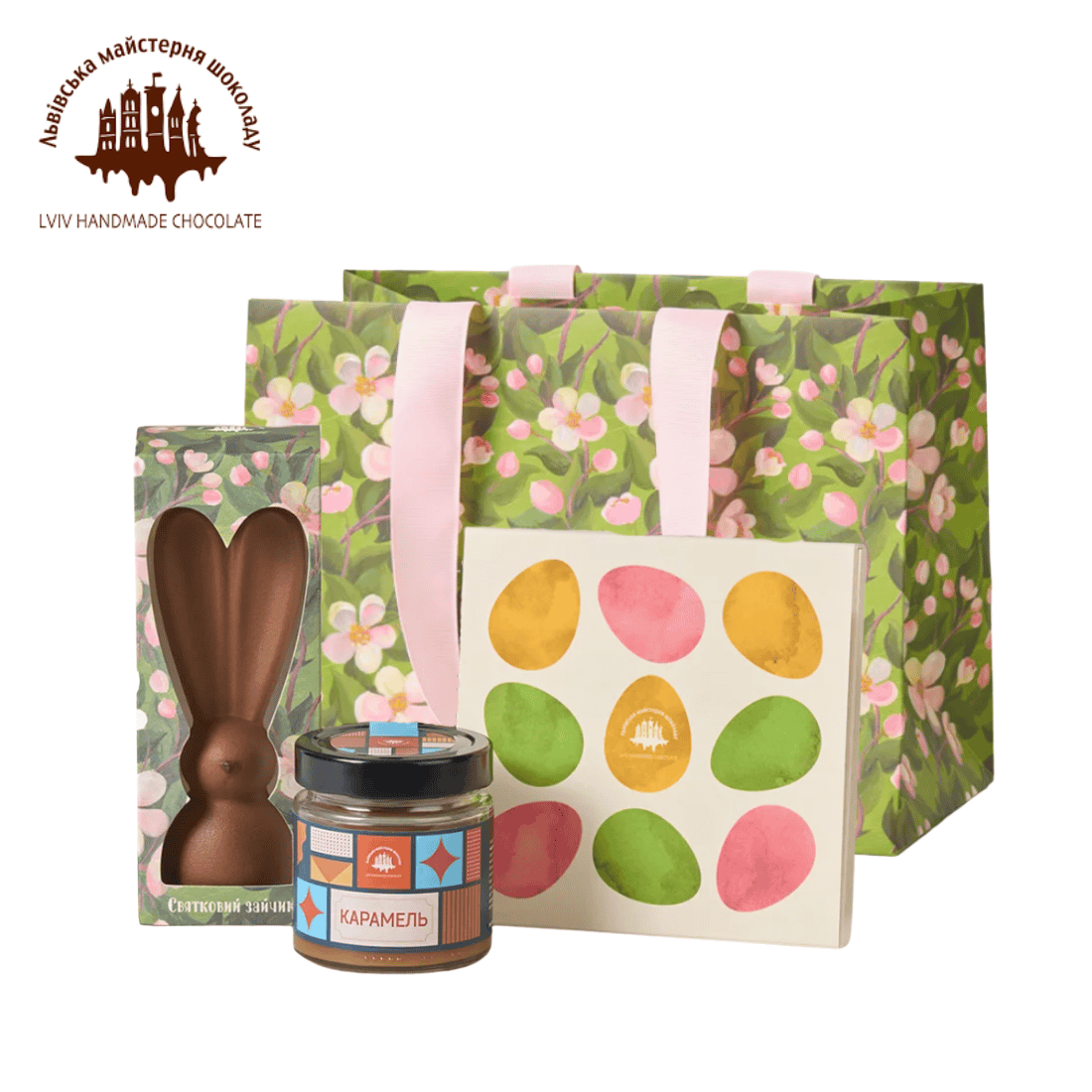 Комплект у подарунковій коробці, який гармонійно доповнить святковий настрій великодніх свят. Шоколадний зайчик, карамельна паста разом з набором шоколадних крашанок стануть окрасою великоднього столу.