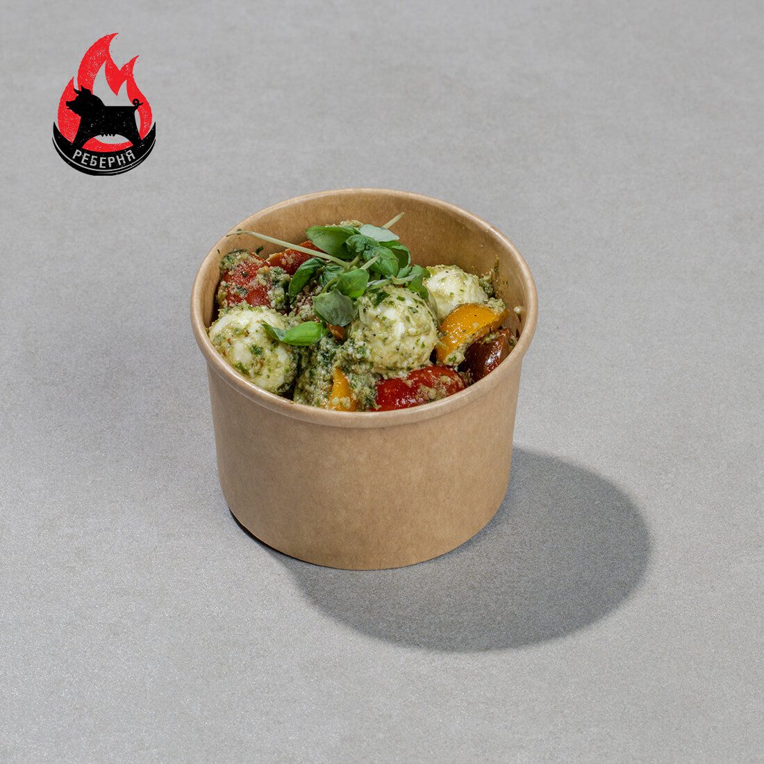 Салат на основі помідорів чері, з додаванням міні моцарели та оновленого соусу песто.