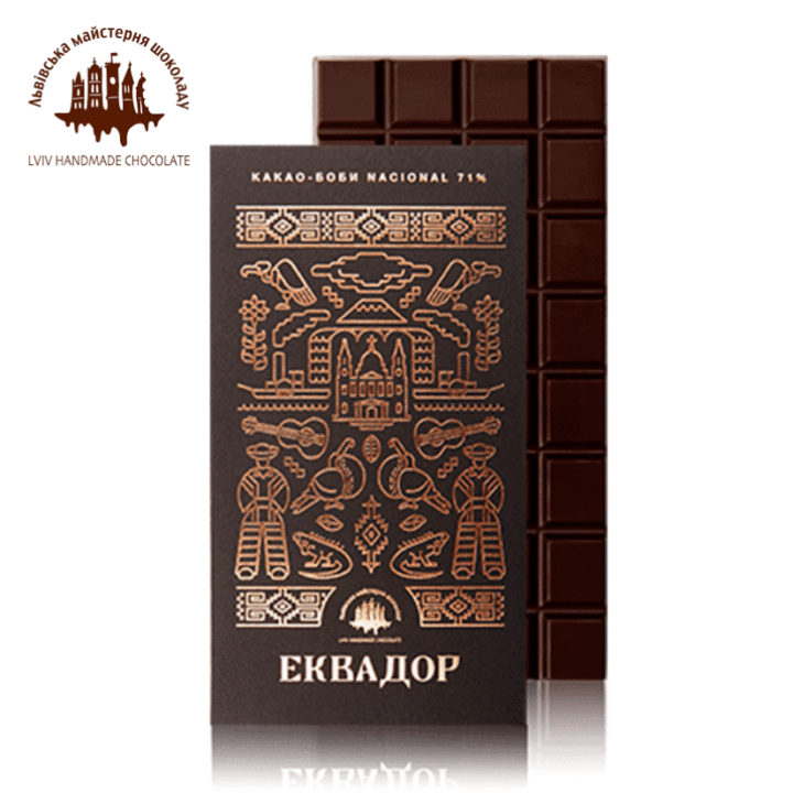 Плитка ексклюзивного чорного шоколаду вагою 80 г з какао-бобів Nacional, що родом з Еквадору. Характерною рисою цього шоколаду є вишуканий смак та насичений аромат бобів. А високий вміст какао 71,5 % дарує дивовижний смак з легкою квітковою ноткою.