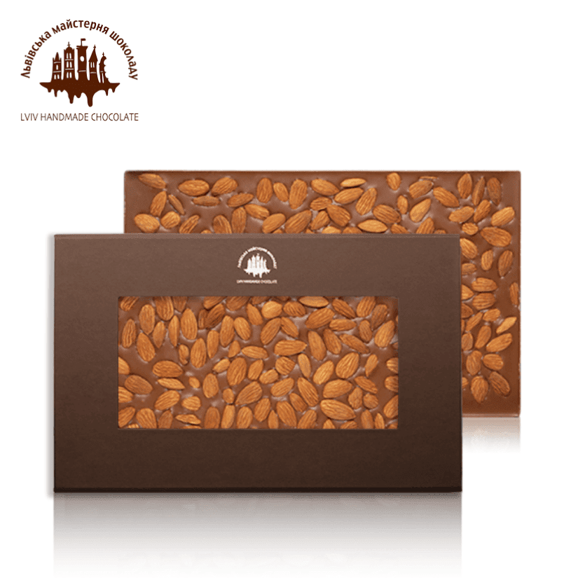 Плитка преміального молочного шоколаду з цільним мигдалем в подарунковій коробці зі стриманим дизайном. Витончений подарунок, який гарно поєднується з іншими презентами та запам’ятається надовго.