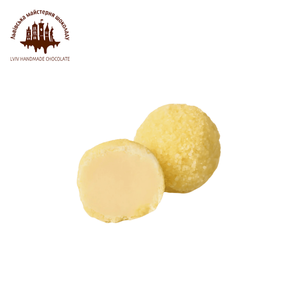 Легкий фруктовий трюфель з ганаша на основі білого шоколаду з банановою пастою. Ззовні ми вкриваємо його білим шоколадом та жовтим цукром, який додає приємного хрусту.