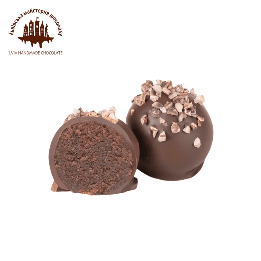 Трюфельна цукерка з вишуканим смаком – поєднання марципана, чорного шоколаду, какао з легкими нотками коньяку, покрита чорним шоколадом. А подрібнені какао-боби зверху додають особливого шарму.