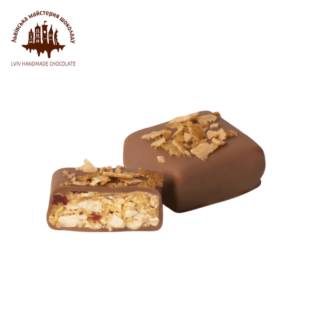 Шоколад молочний (цукор, какао-масло, молоко сухе незбиране (22,4 %), какао терте, емульгатор: соєвий лецитин, ваніль натуральна), цукор білий, журавлина сушена, ядро горіха кеш’ю смажене подрібнене, сухі хрусткі пластівці (борошно пшеничне в/с, цукор, масло вершкове, соняшникова олія, молоко сухе знежирене, ячмінний солод, сіль харчова), мед натуральний, масло вершкове, регулятор кислотності кислота лимонна.