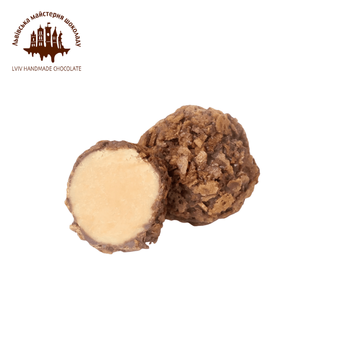 Ніжний ганаш на основі білого шоколаду з карамельною пастою. Зверху ми покриваємо цукерку чорним шоколадом та хрусткими пластівцями для задоволення усіх солодких забаганок чи, як у Львові кажуть – “захцянок”.