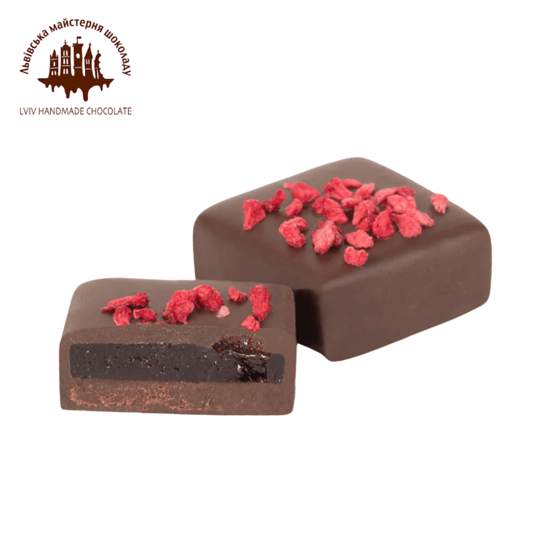 Шоколад чорний (какао терте, цукор, какао-масло, емульгатор: соєвий лецитин, ваніль натуральна), цукор білий, пюре вишні та малини свіжоморожене, суміш на основі рослинних жирів (рослинний пальмовий гідрогенізований жир, цукор, молочний білок, стабілізатори (сорбітовий сироп, целюлоза, Е466), емульгатори (Е472е, Е435, соєвий лецитин), сіль харчова, барвник: бета-каротин, ароматизатор вершковий), сироп глюкози, малина сублімована, масло вершкове, пектин яблучний, ром.