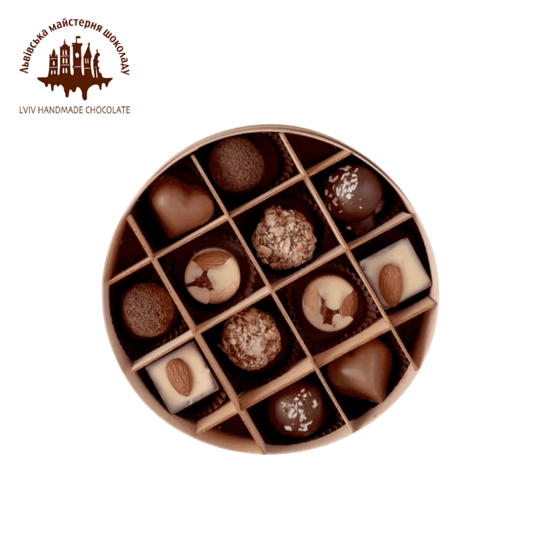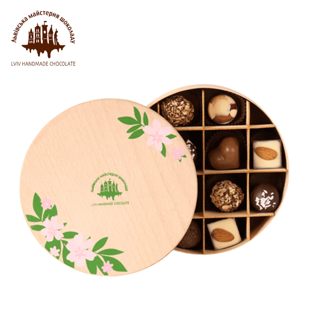 Набір із 12 вишуканих марципанових, трюфельних та горіхових цукерок, покритих шоколадом. Шість різних смаків, які разом дарують справжній весняний настрій: фруктові начинки, з горіхами чи легкими кавовими нотками. А дерев`яна коробка круглої форми додає елегантного шарму.