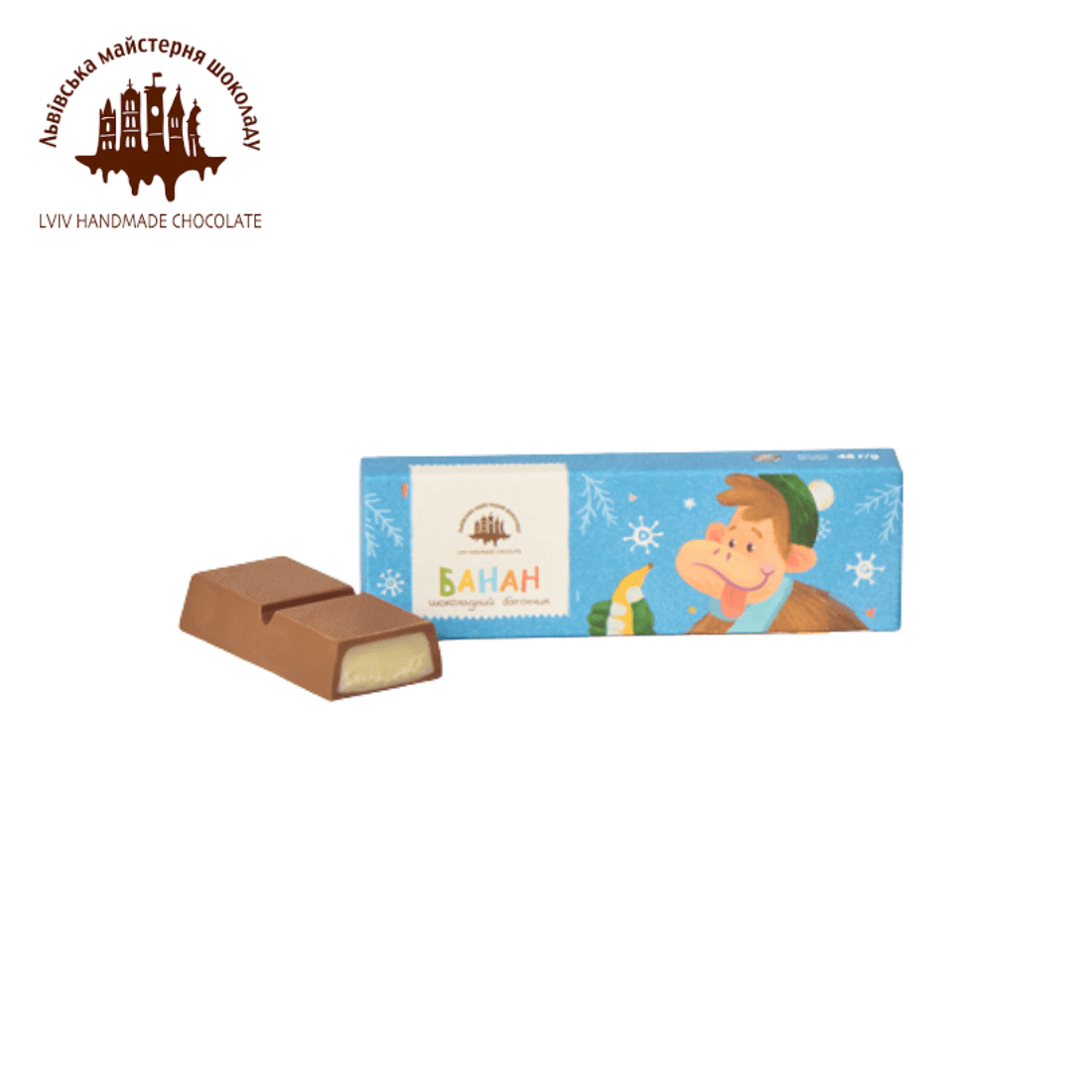 Шоколад молочний (цукор, какао-масло, молоко сухе незбиране (22,4 %), какао терте, емульгатор: соєвий лецитин, ваніль натуральна), шоколад білий (цукор, какао-масло, молоко сухе незбиране, емульгатор: соєвий лецитин, ваніль натуральна), начинка на основі білого шоколаду (білий шоколад (цукор, молоко сухе незбиране, какао-масло, емульгатор: соєвий лецитин, ароматизатор «Ваніль»), рафінований рослинний жир: пальмовий і ріпакова олія, молочний жир), суміш на основі рослинних жирів (рослинний пальмовий гідрогенізований жир, цукор, молочний білок, стабілізатори (сорбітовий сироп, целюлоза, Е466), емульгатори (Е472е, Е435, соєвий лецитин), сіль харчова, барвник: бета-каротин, ароматизатор вершковий), ароматична суміш банан (сироп глюкози, цукор, банан, банановий концентрат, лимонний концентрат, натуральний ароматизатор, цитрусова клітковина).